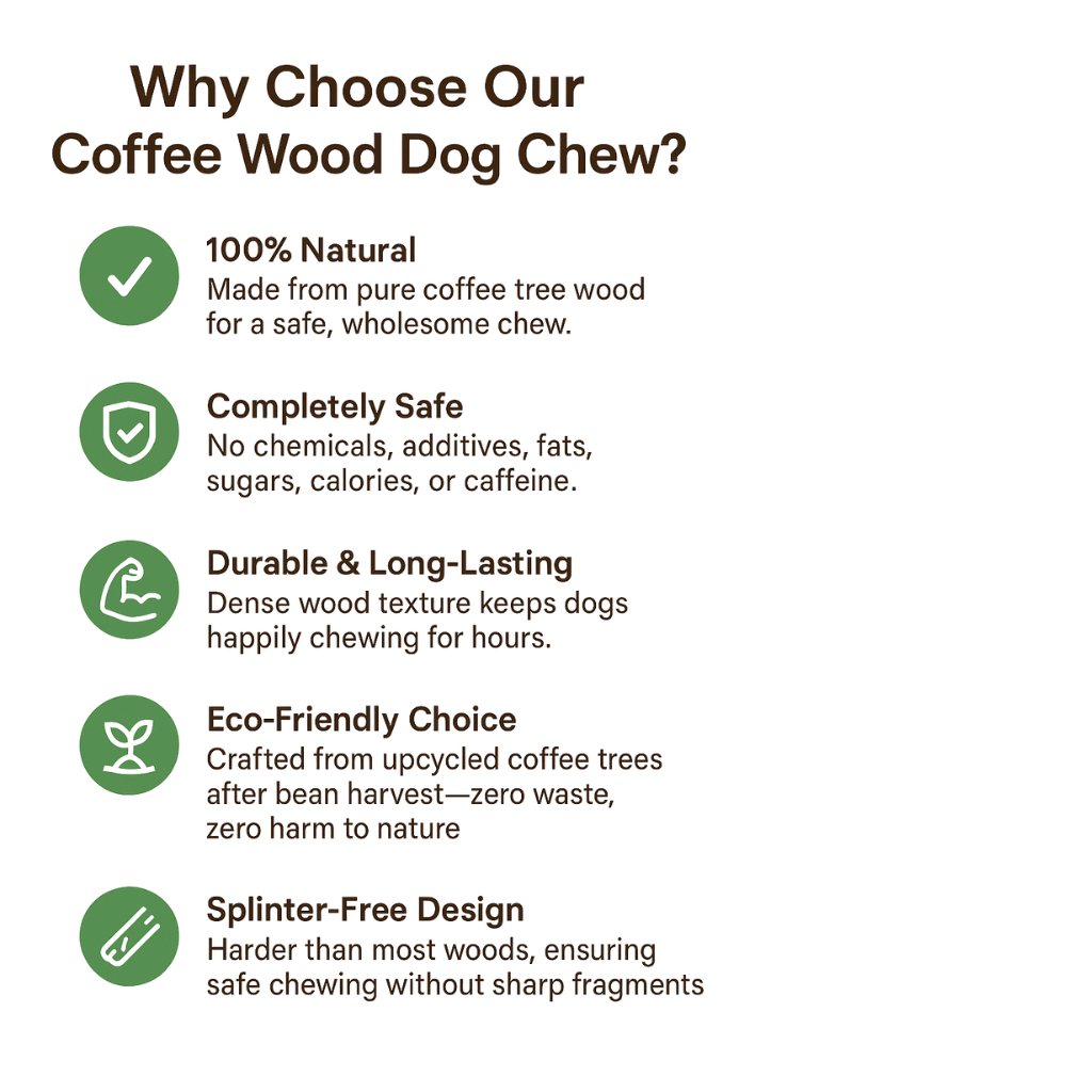 Our chews are made from 100% natural coffee wood, free from caffeine, calories, artificial additives, or chemicals. It is safe, durable, and eco-friendly.